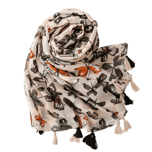 Nature-inspired Beige Butterfly Scarf with Tassels