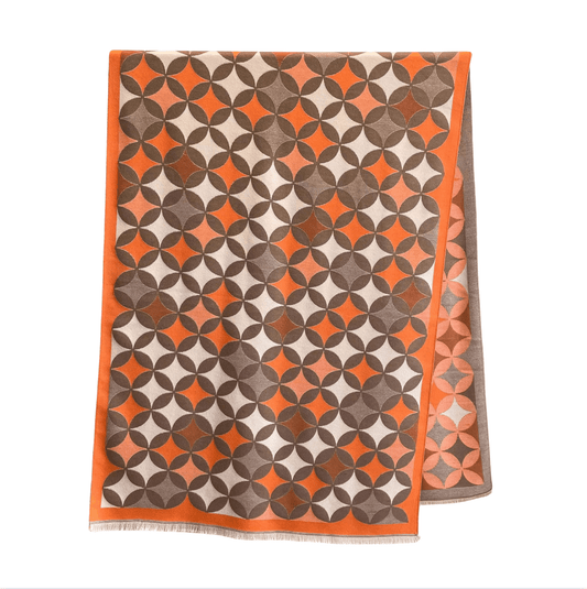 Orange, Beige & Brown Circular Star Patterned Fringe-Trimmed Scarf