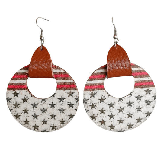 Burnt Orange Stars & Stripes - Faux Leather Strap & Patterned Circular Drop Earrings