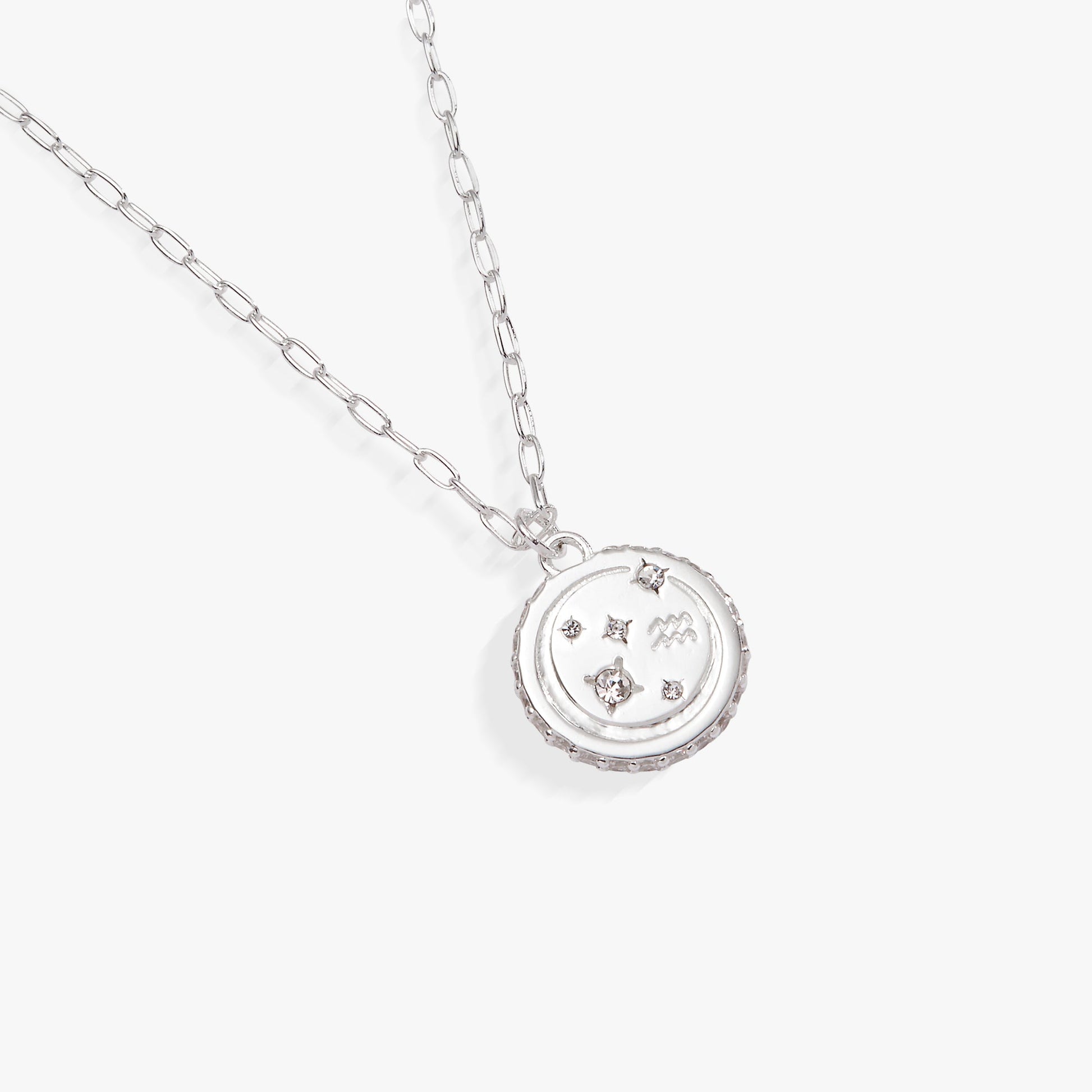 Aquarius is a creative, independent intellectual. This Aquarius pendant necklace celebrates this air sign with a double-sided engraved charm: one side has Aquarius signs, and the other has the full zodiac wheel, both with crystal accents. Wear it and remember you were written in the stars.