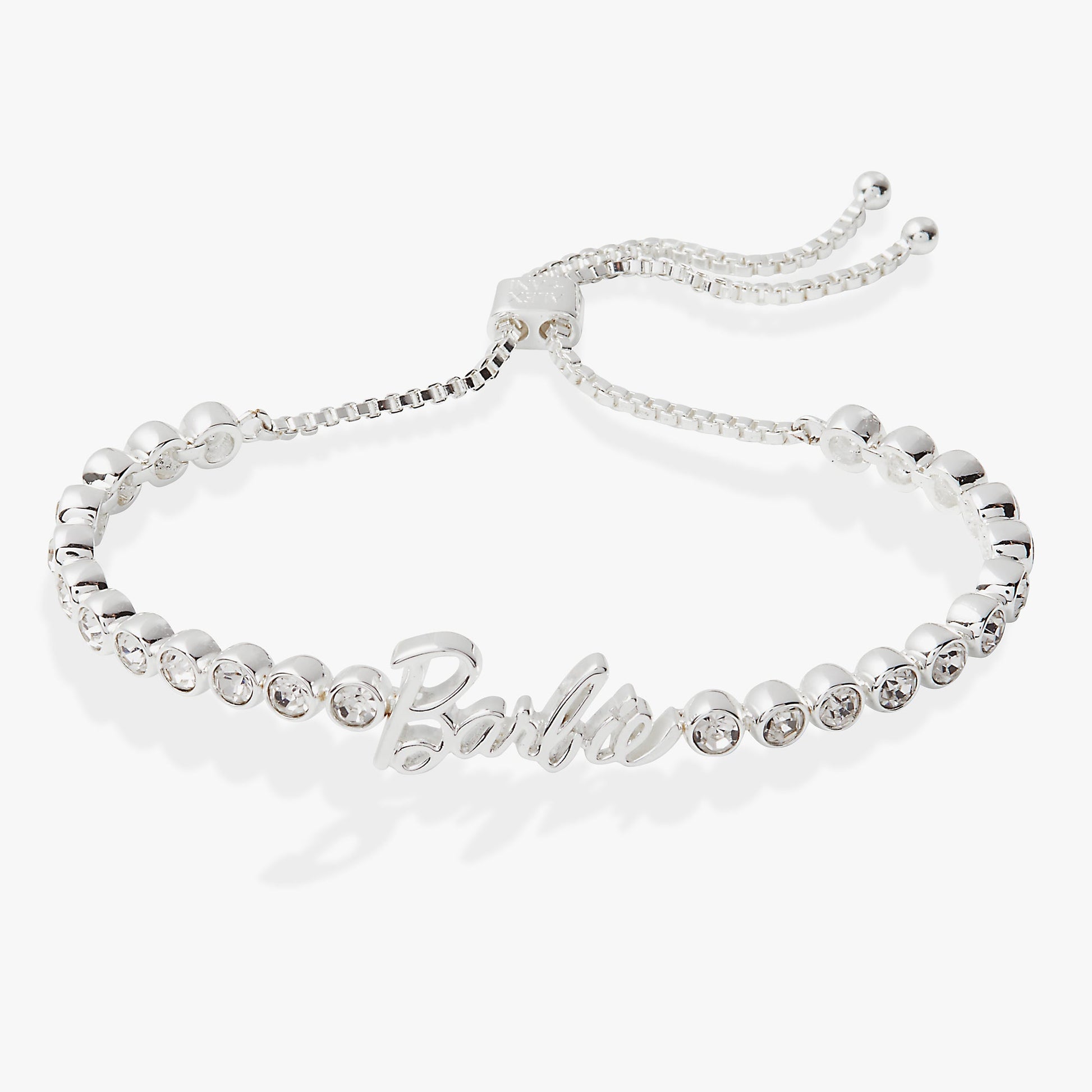 Add a touch of glamour to your look with the Barbie™ bracelet! Featuring a stylish silver cable chain and dazzling pave crystals, this adjustable bolo bracelet will add an elegant sparkle to any outfit. The signature Barbie™ charm is the perfect finishing touch.
