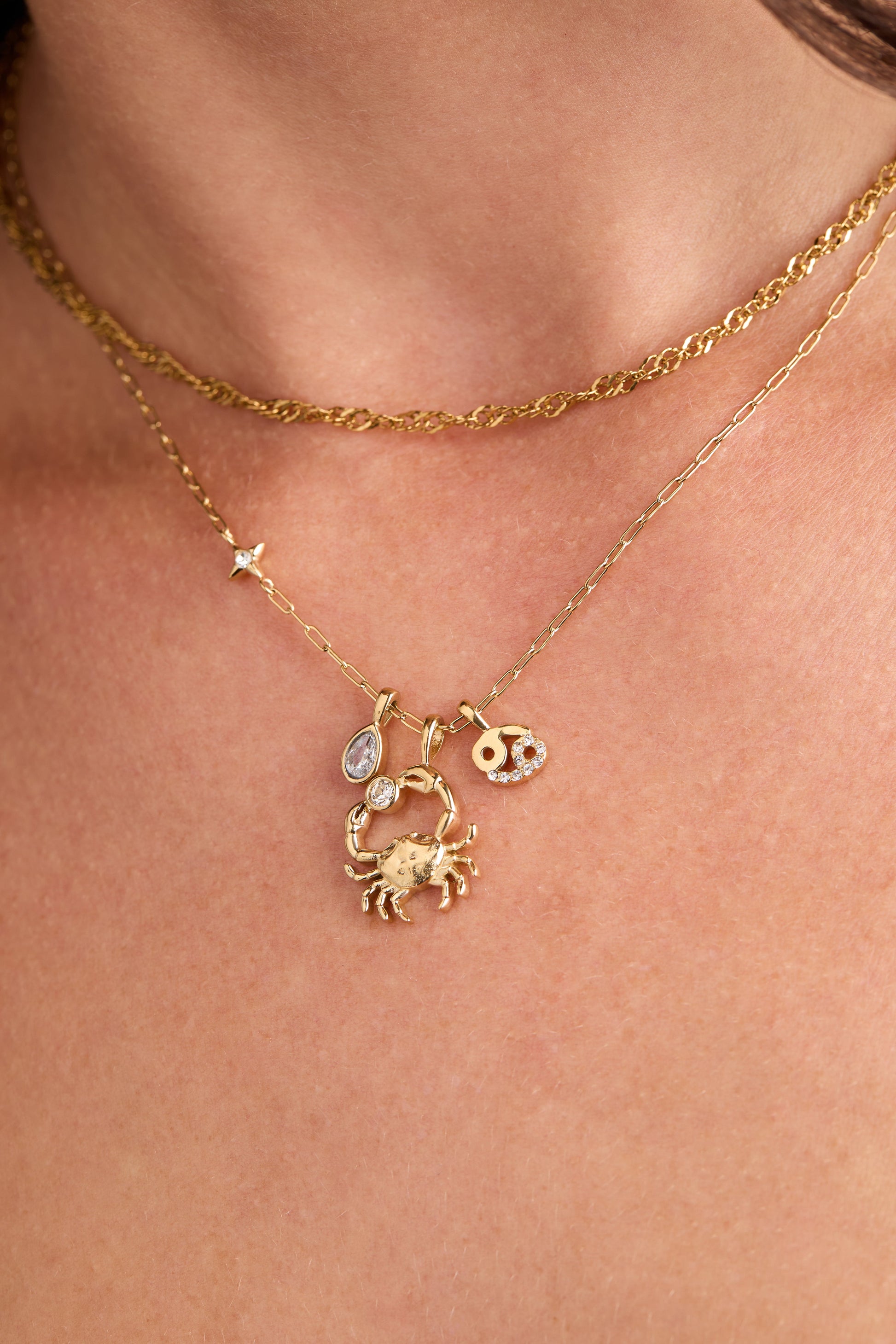 Celebrate your cosmic identity with this enchanting Cancer zodiac necklace. Crafted in gold-plated stainless steel, it features three captivating charms: a sparkling crystal-pave Cancer symbol, a dimensional crab design, and a water droplet-shaped crystal representing your element. The delicate, refined styling works beautifully layered with other pieces or worn solo as a meaningful statement. Perfect for zodiac lovers who want a touch of celestial sparkle with everyday wearability.