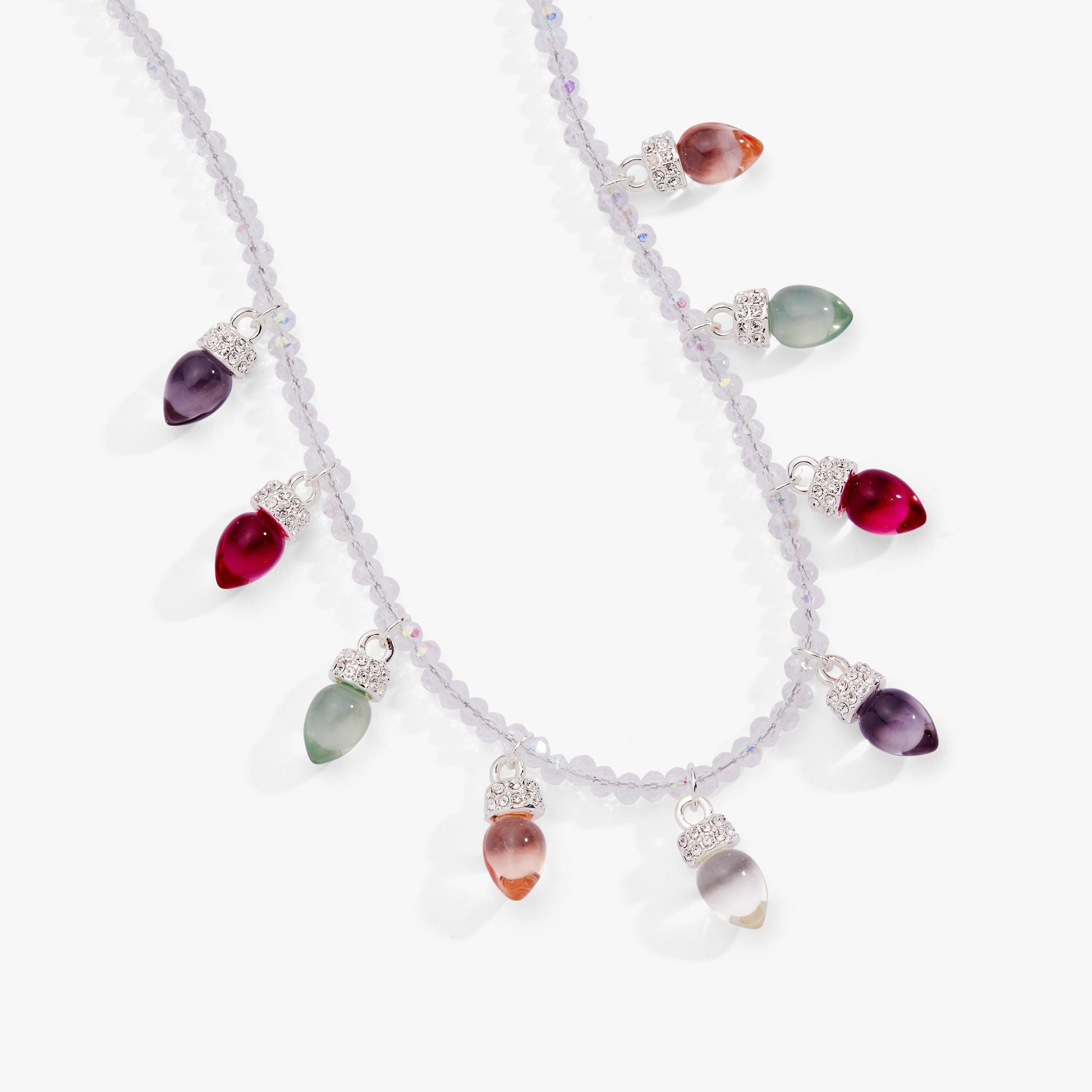 Brighten your day with this playful Light Bulb Beaded Necklace, showcasing a chain of faceted clear beads that catch the light from every angle. Softly colored resin bulbs in muted tones add a whimsical touch, while sparkling crystal pavé accents bring just the right amount of sparkle. Perfect for adding a fun yet elegant flair to any outfit, this necklace is a charming way to express your unique style with a hint of brightness.
