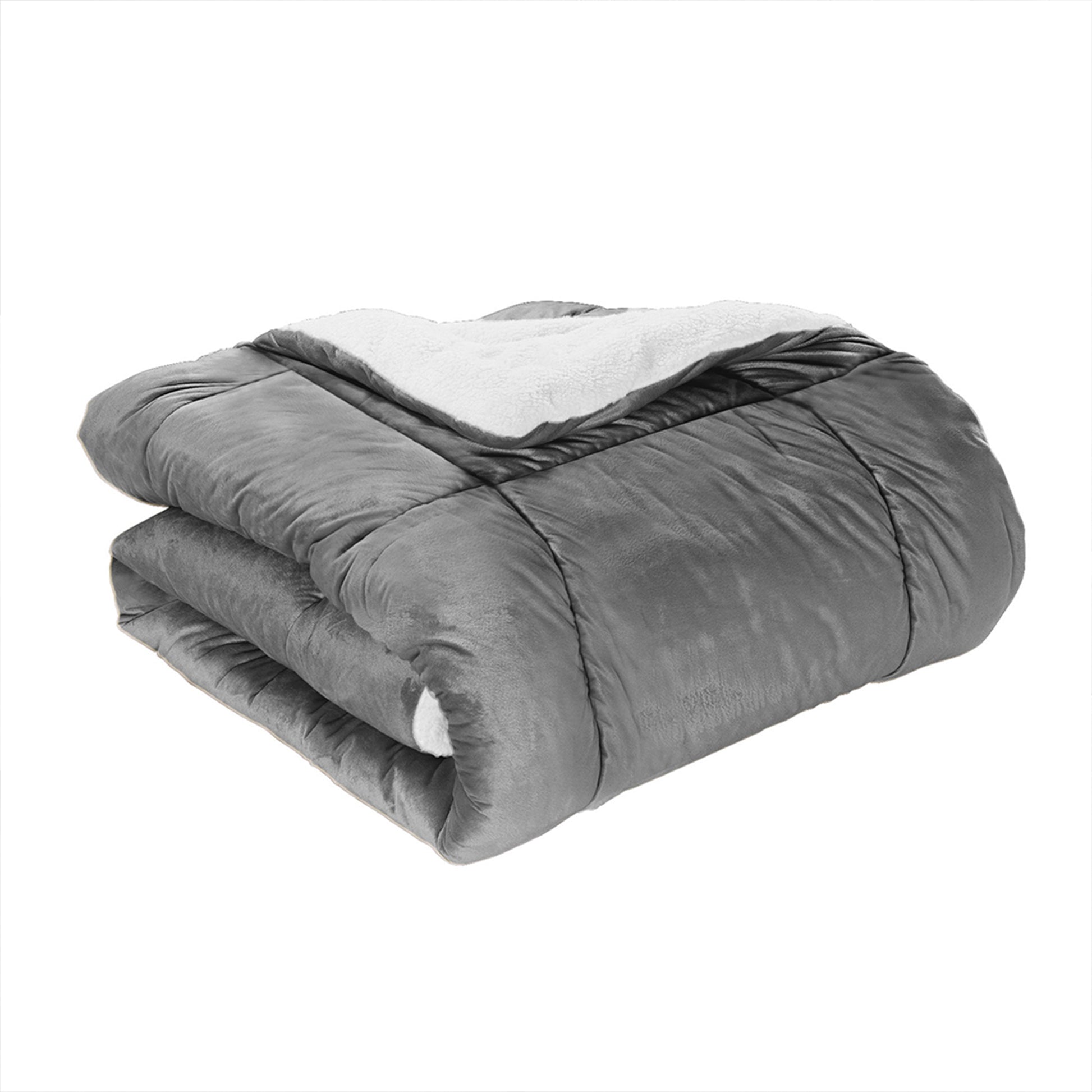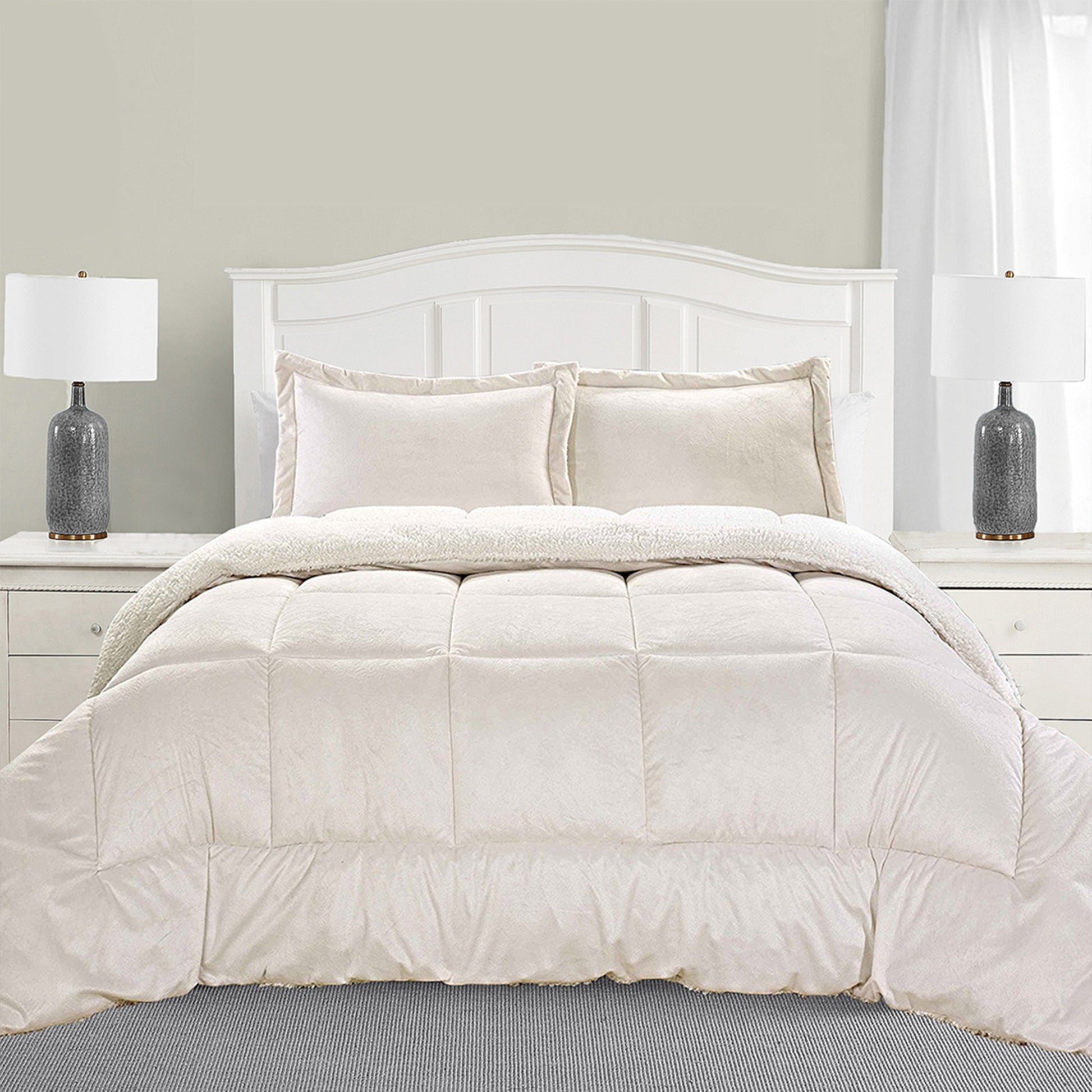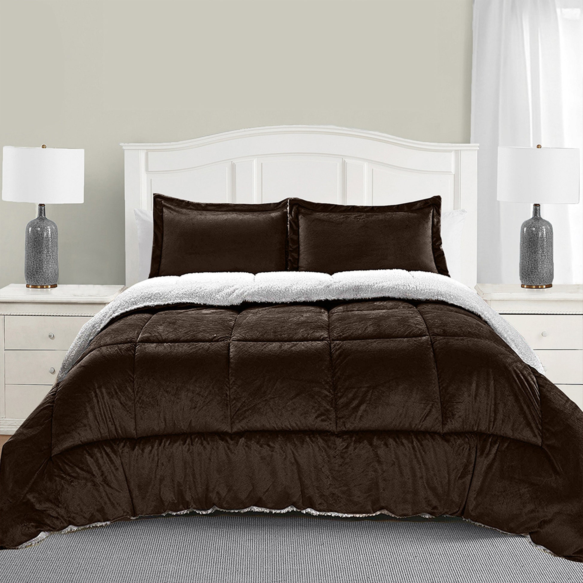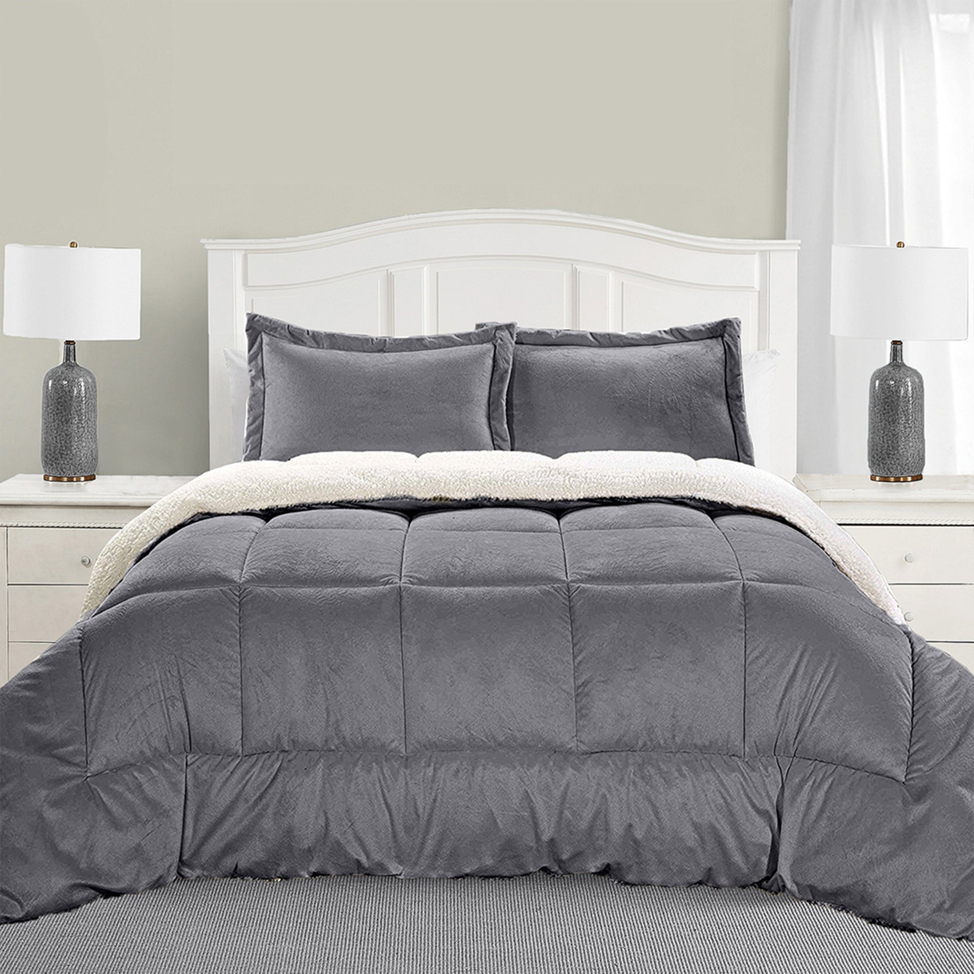 Our solid sherpa set has a square-stitched design to prevent the filling from shifting. Reversible design with micromink sherpa on one side and white Microsuede Flannel Velvet Touch on the reverse; both sides offer supreme softness and cozy warmth for any season.