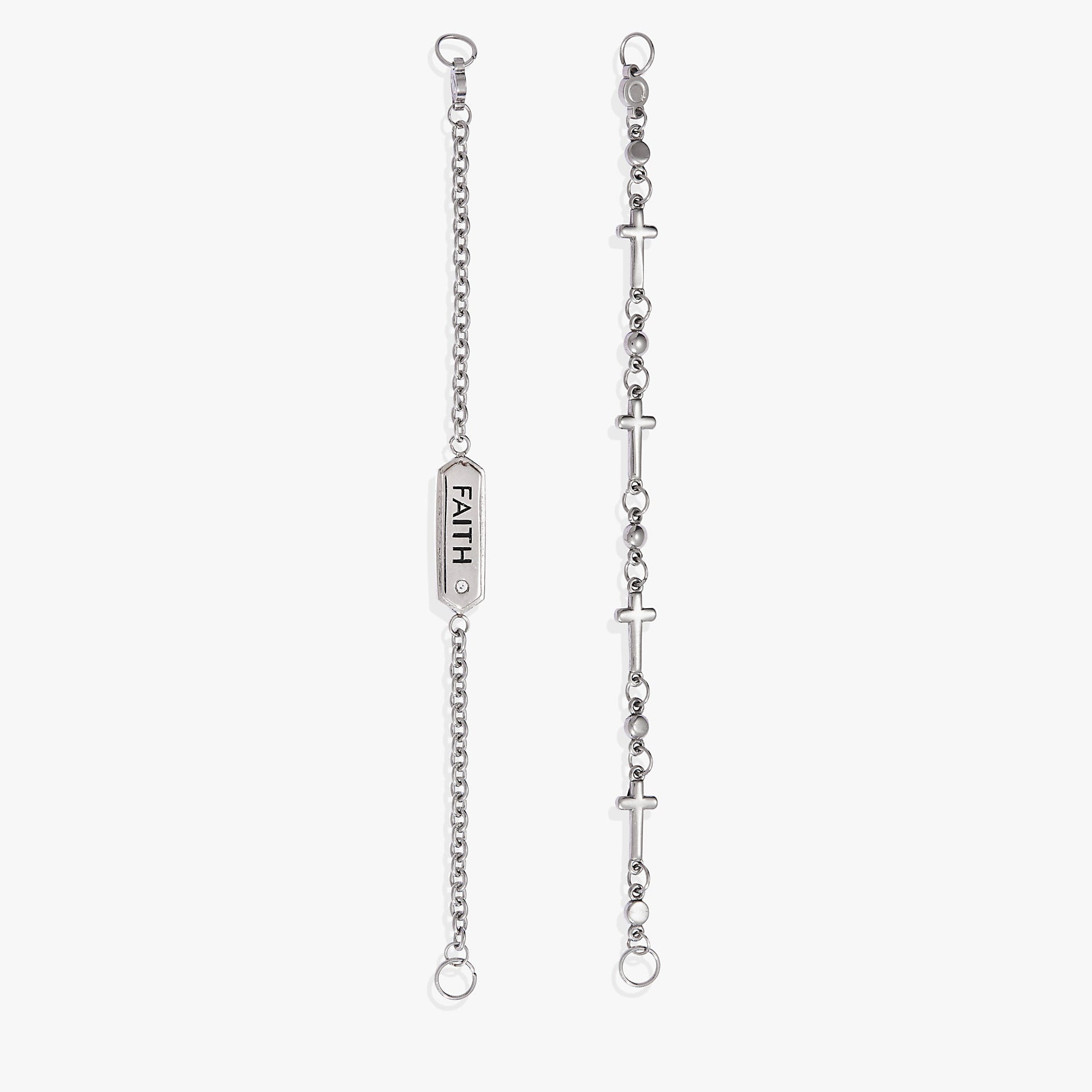 Wear symbols of deepest-held beliefs with this Stranded™ Faith Bracelet Set, which features two bracelet strands. One is a chain bracelet with an in-line plate that says “Faith” accented with cubic zirconia, and the other has in-line cross charms in a chain bracelet. The Stranded™ Collection features an all new, interchangeable design. Bracelet strands attach to an adjustable-length keeper included with the set. Swap out strands from different pieces and combine them to make a style that’s all your own.
