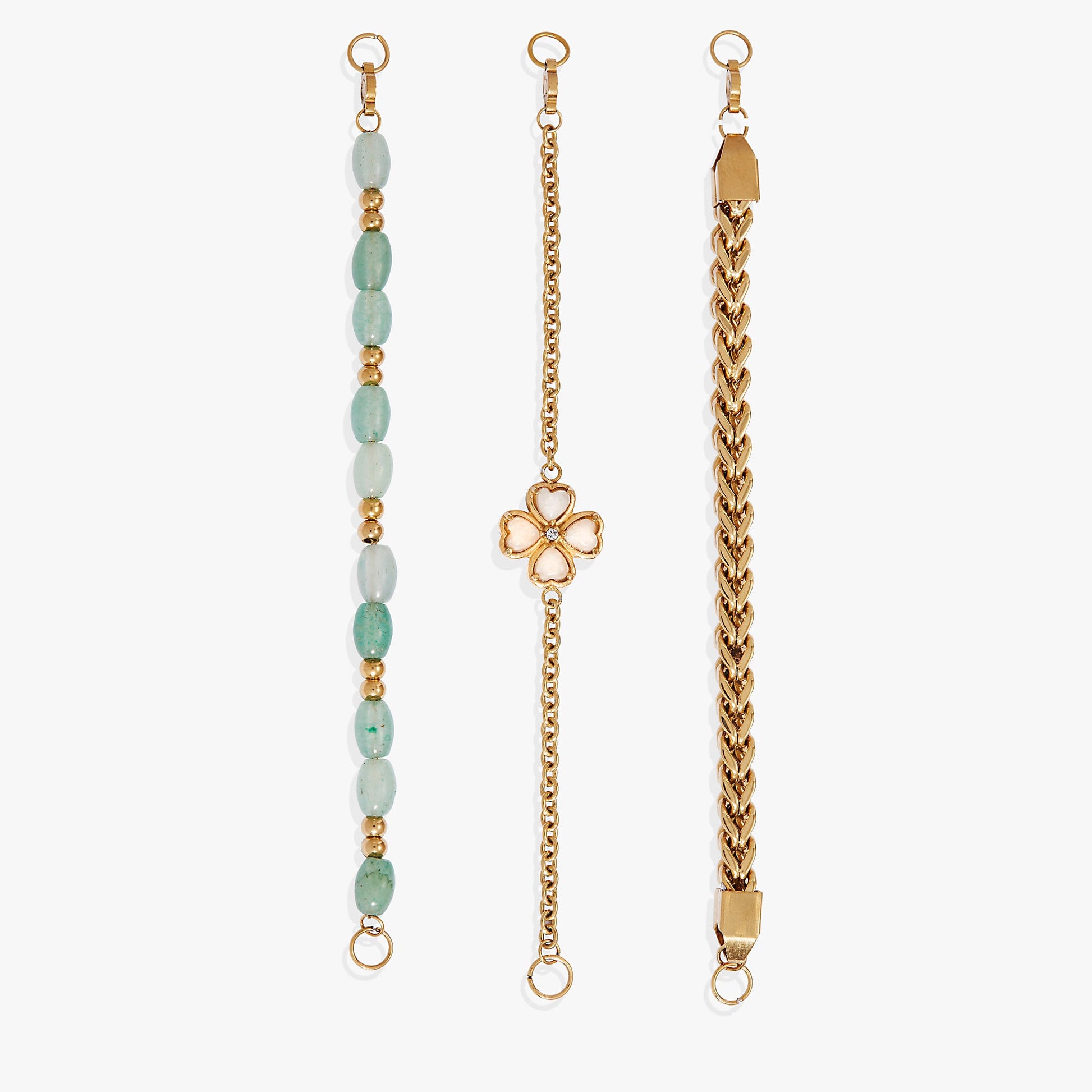 Wear symbols of luck with this Stranded™ Four-Leaf Clover Bracelet Set, which features three bracelet strands. One has an in-line charm with a White Jade four-leaf clover with cubic zirconia accents on a chain bracelet, one is a chunky herringbone chain bracelet, and one has semi-precious Green Aventurine beads. White Jade is a stone of positivity, Green Aventurine is said to promote optimism. The Stranded™ Collection features an all-new, interchangeable design. Bracelet strands attach to an adjustable length keeper, included with the set. Swap out strands from different pieces and combine them to make a style that’s all your own.