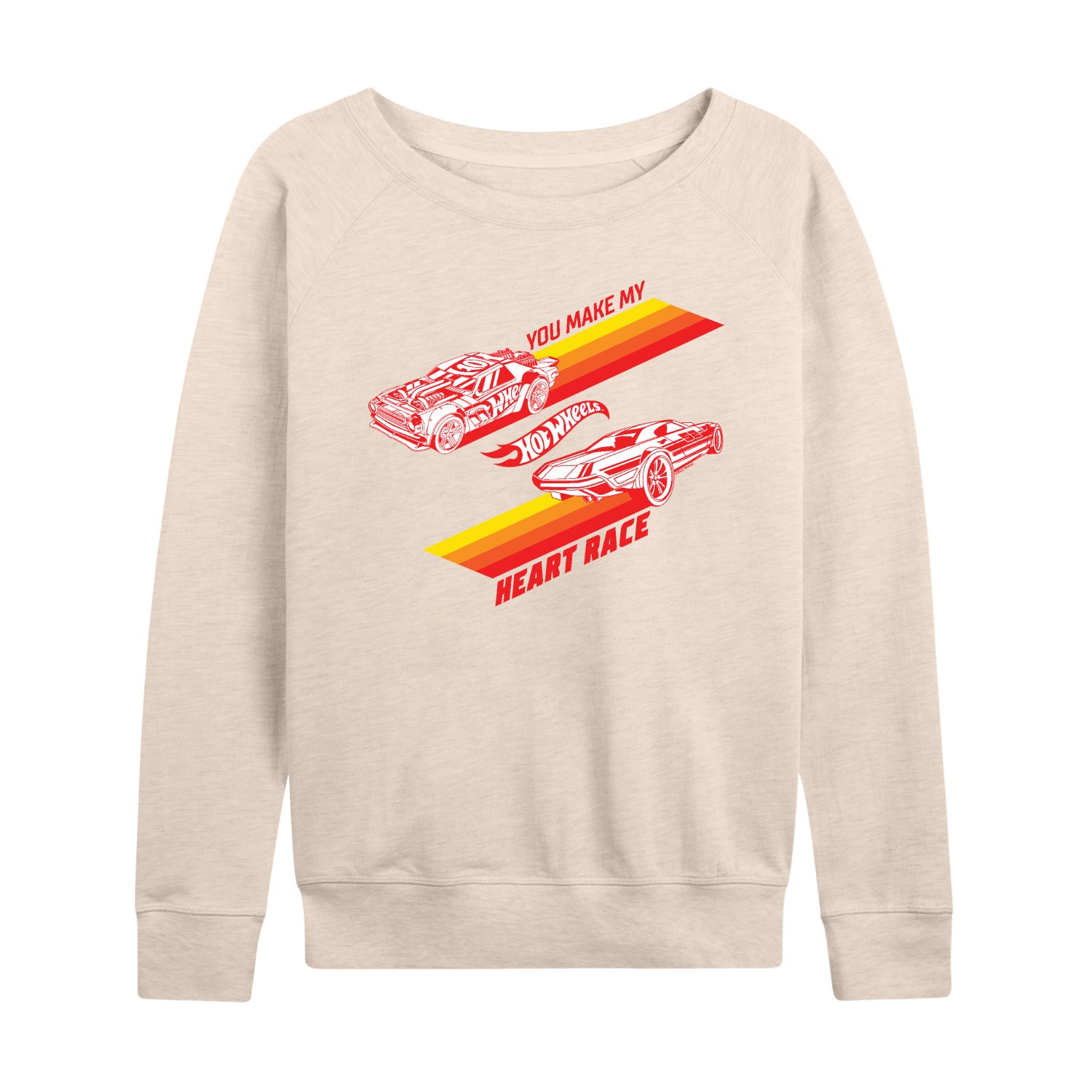 Hot Wheels - Valentine's You Make My Heart Race - Ladies French Terry Long Sleeve Shirt - Speed into bold style with Hot Wheels graphic apparel, featuring high-octane designs that showcase legendary cars like the Twin Mill, Bone Shaker, and other fan favorites. Each piece captures the adrenaline-pumping excitement of epic tracks, jaw-dropping stunts, and non-stop racing action. Perfect for fans of all ages who grew up launching cars off orange tracks and collecting miniature speed machines, this collection brings the thrill of Hot Wheels to your everyday look with energy, nostalgia, and unmistakable style.