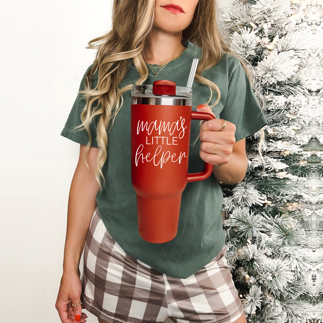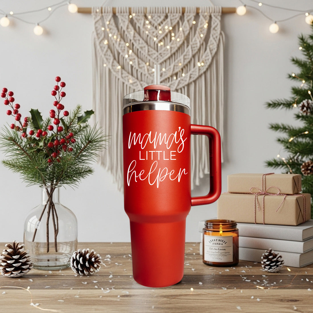 Say hello to your new best friend: our 40oz tumbler in chic red or green, emblazoned with "Mama's Little Helper." Whether you're fueling up for a day of endless errands or sneaking a well-deserved break, this tumbler's got your back.
