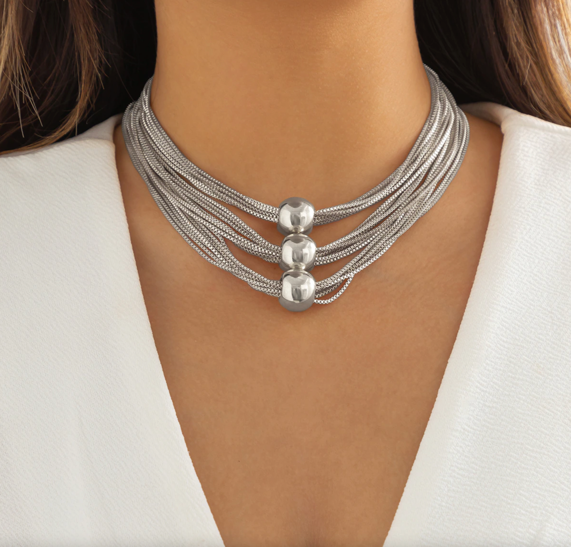 The Multi Chain Silvertone Layered Ball Necklace offers a stunning focal point for any outfit. Whether layered or worn alone, it delivers eye-catching style and refined elegance.