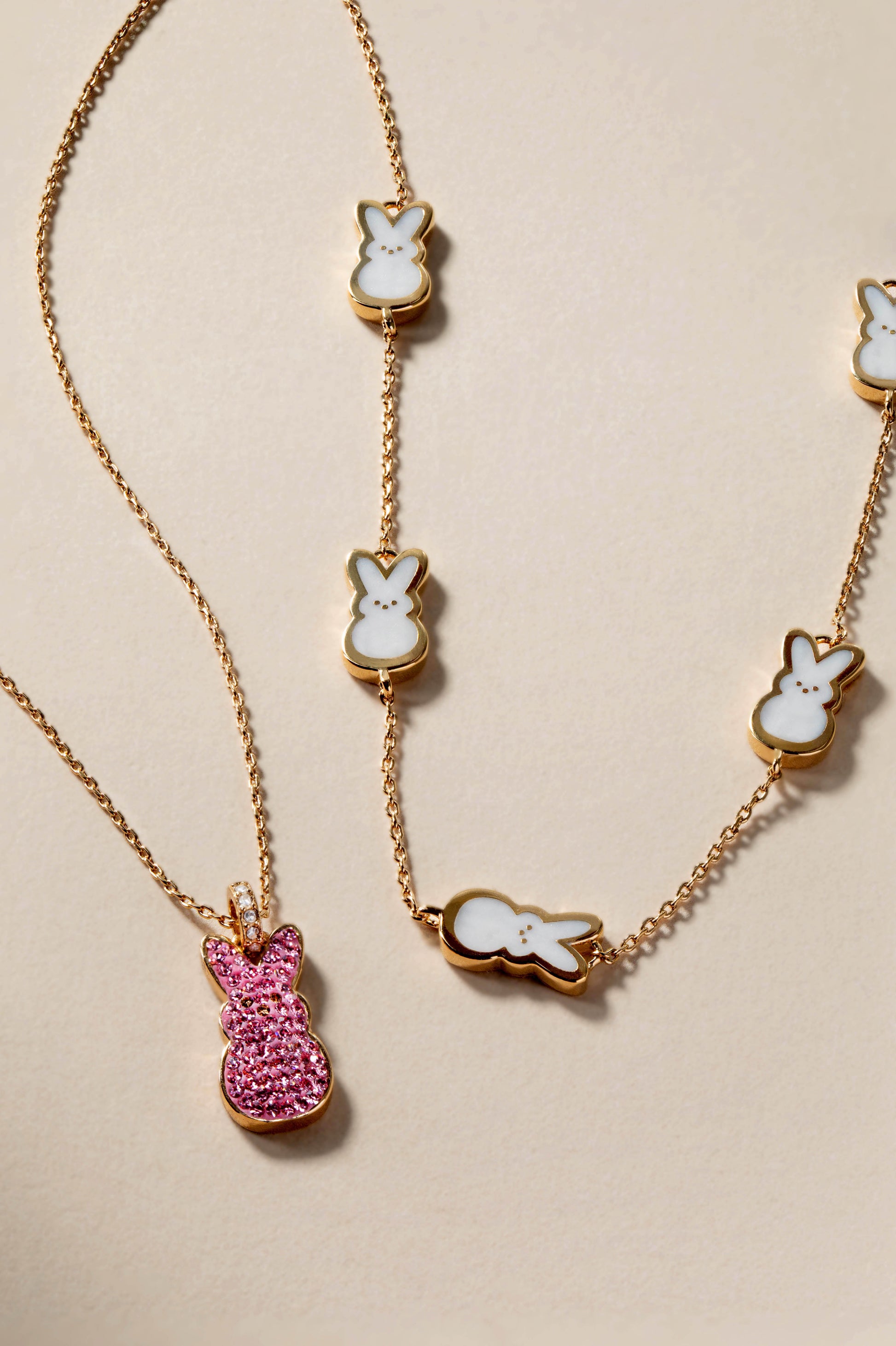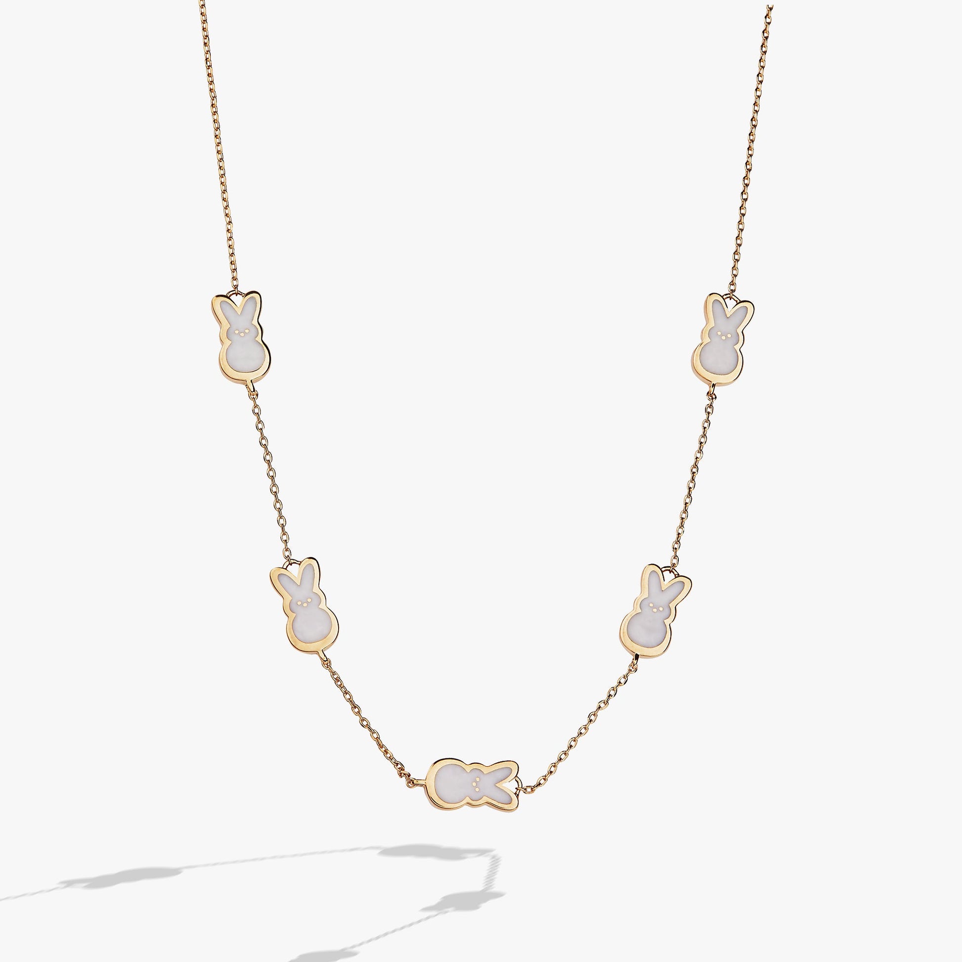 Celebrate everything sweet about springtime and Easter with this PEEPS® Pearlized Bunny Charm Necklace, which features pearlized PEEPS® bunny charms inline on an adjustable-length chain necklace. Wear it to welcome the season — or gift it to somebunny you love.