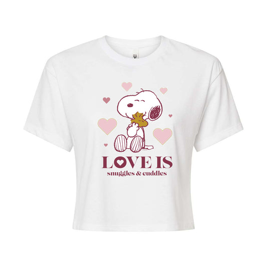 Peanuts - Love is Snuggles and Cuddles - Juniors Cropped Graphic T-Shirt