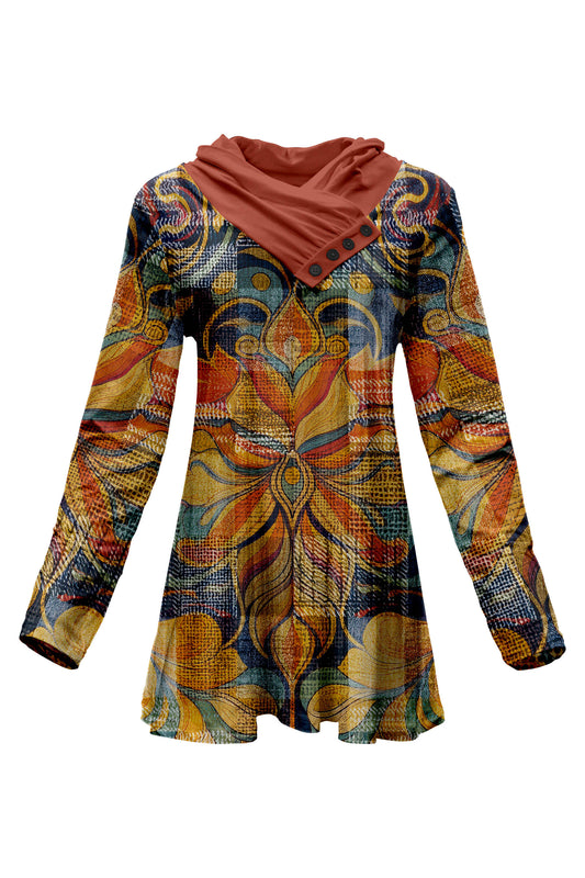 Lily by Firmiana Women's Shawl Neck Tunic with 4-Button Placket and Long Sleeves Brown and Multicolored Fall Patchwork