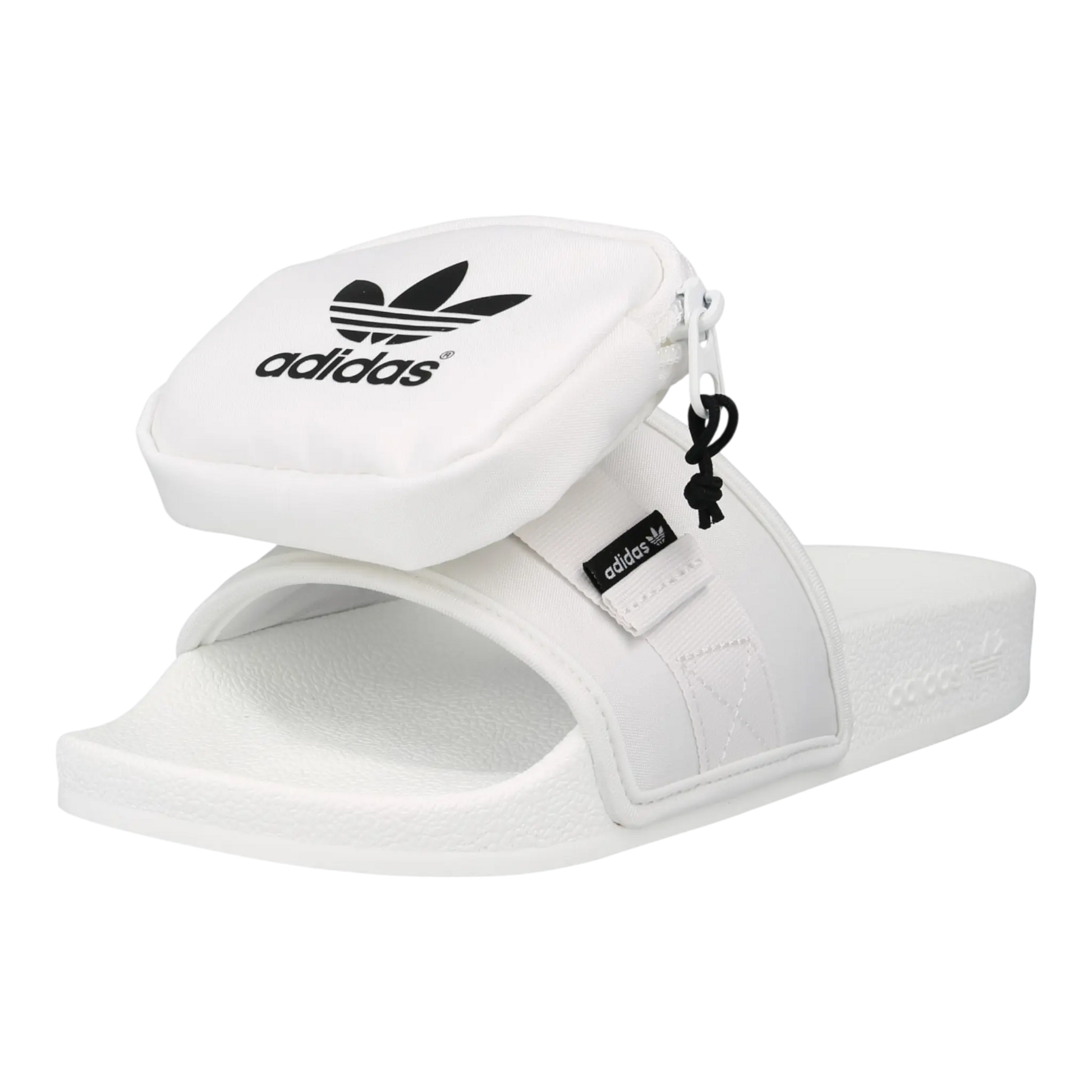 The Adidas Pouchylette W Women’s Slide offers a playful twist on the classic slip-on, with a removable mini pouch and soft comfort in cloud white and core black.