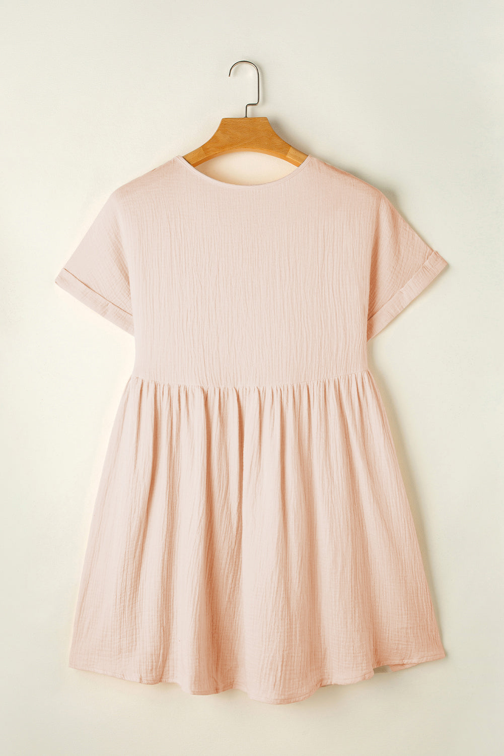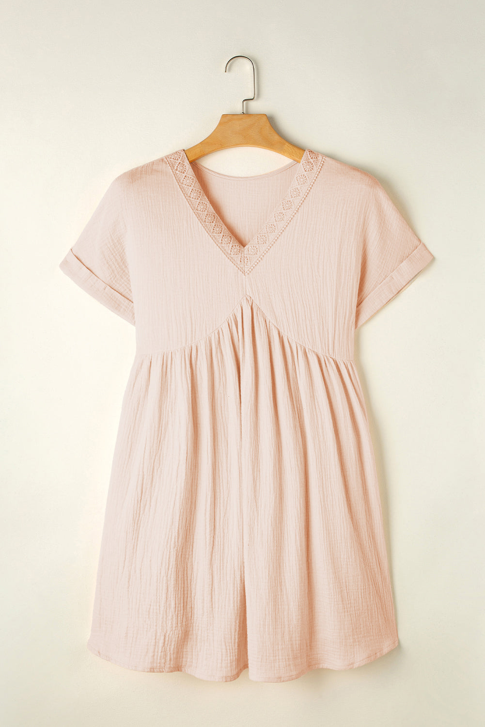 This breezy summer dress is ideal for warm weather! With a dainty lace accent at the V-neckline, a trendy rolled sleeve style, and a comfortable flared silhouette, it's a simple yet stylish choice for any age