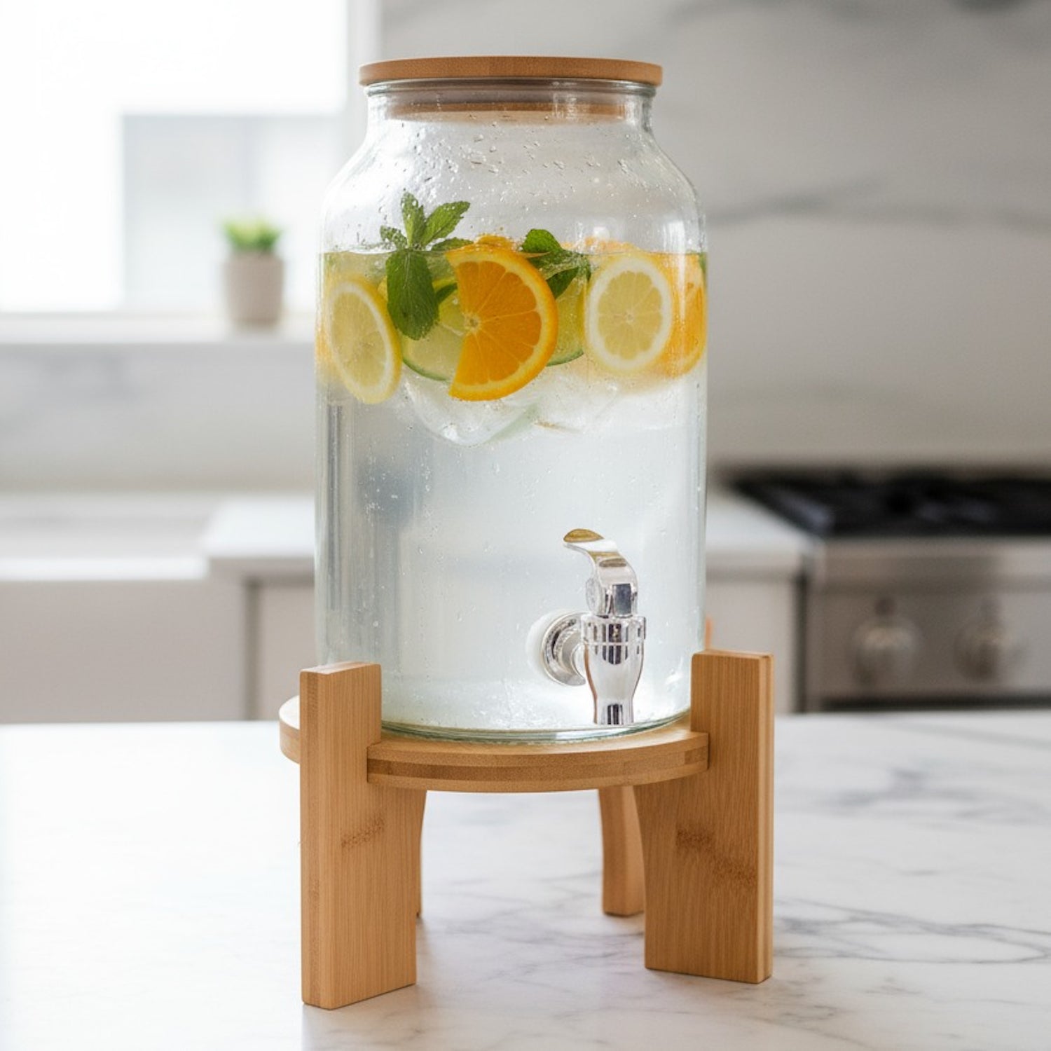 This 4-liter capacity vessel features premium borosilicate glass construction paired with an electroplated metal top and matching bamboo stand, delivering both functionality and refined aesthetics.