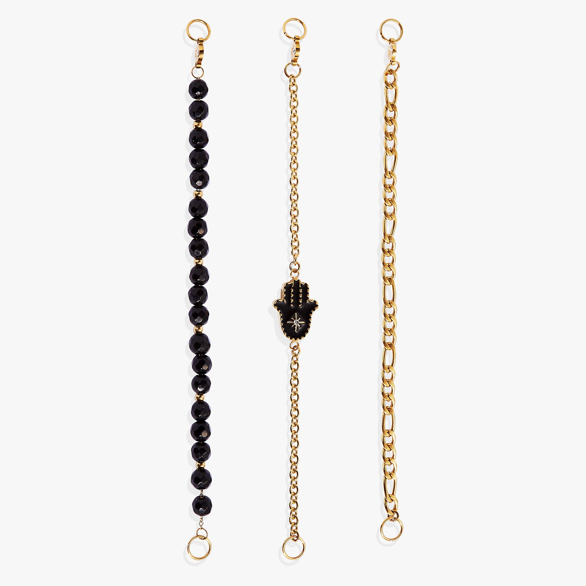 Wear symbols of protection with this Stranded™ Hamsa Bracelet Set, which features three bracelet strands. One has an in-line charm with a buffed epoxy hamsa hand with cubic zirconia accents on a chain bracelet, one is a chain link bracelet, and one has semi-precious Black Onyx beads, believed to help center and balance the wearer. The Stranded™ Collection features an all new, interchangeable design. Bracelet strands attach to an adjustable-length keeper, included with the set. Swap out strands from different pieces and combine them to make a style that’s all your own.