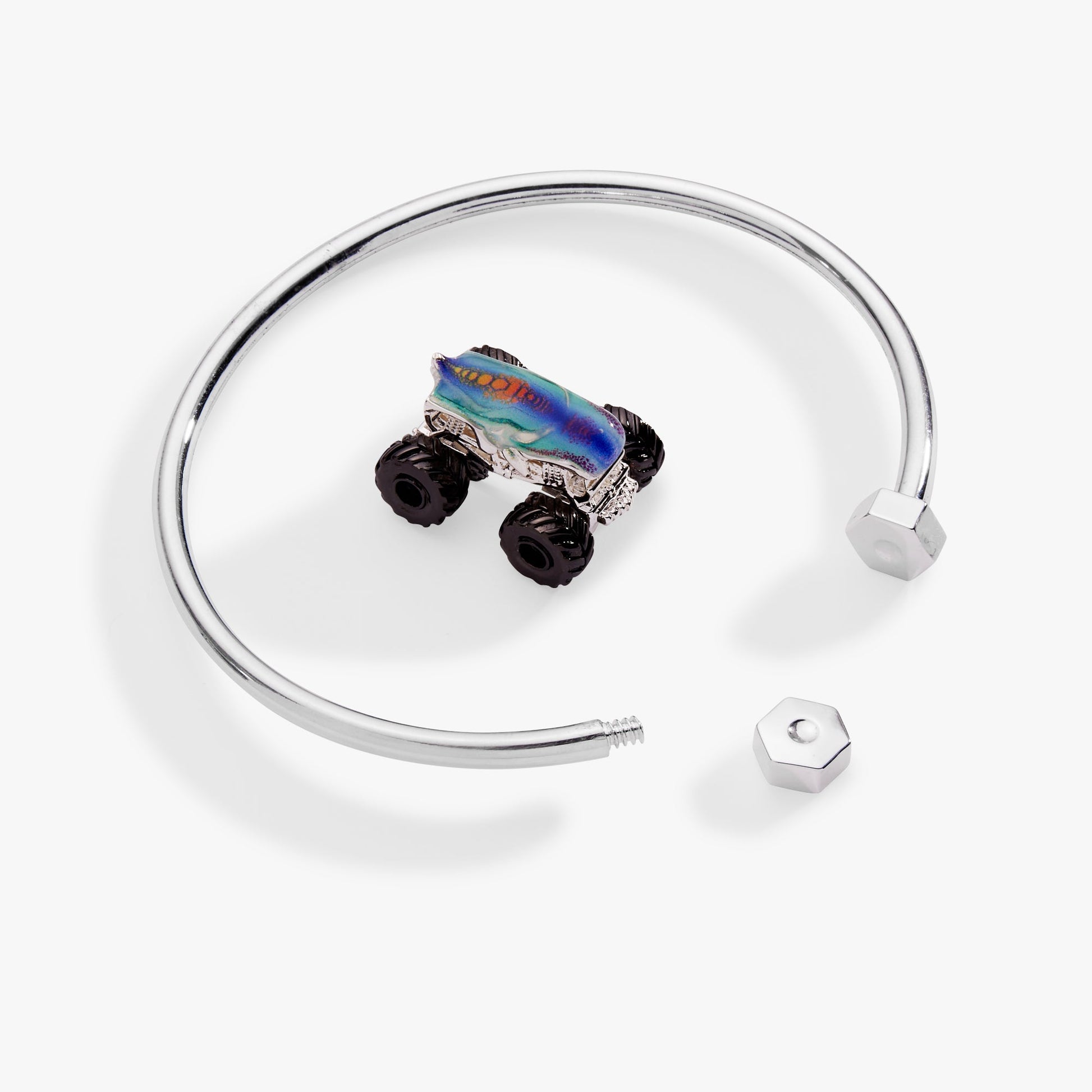 Get ready to smash and crash with this Hot Wheels™ Mega Wrex™ cuff that's packed with personality and motion. The bead's spinning wheels transform it into a fidget toy you can wear, while bold printed details capture that iconic Hot Wheels™ Monster Truck attitude. The hexbolt endcaps, and the smooth silicone slider makes removal of the bead effortless. Whether you're a speed enthusiast or charm collector, this cuff delivers fun that never stops rolling.