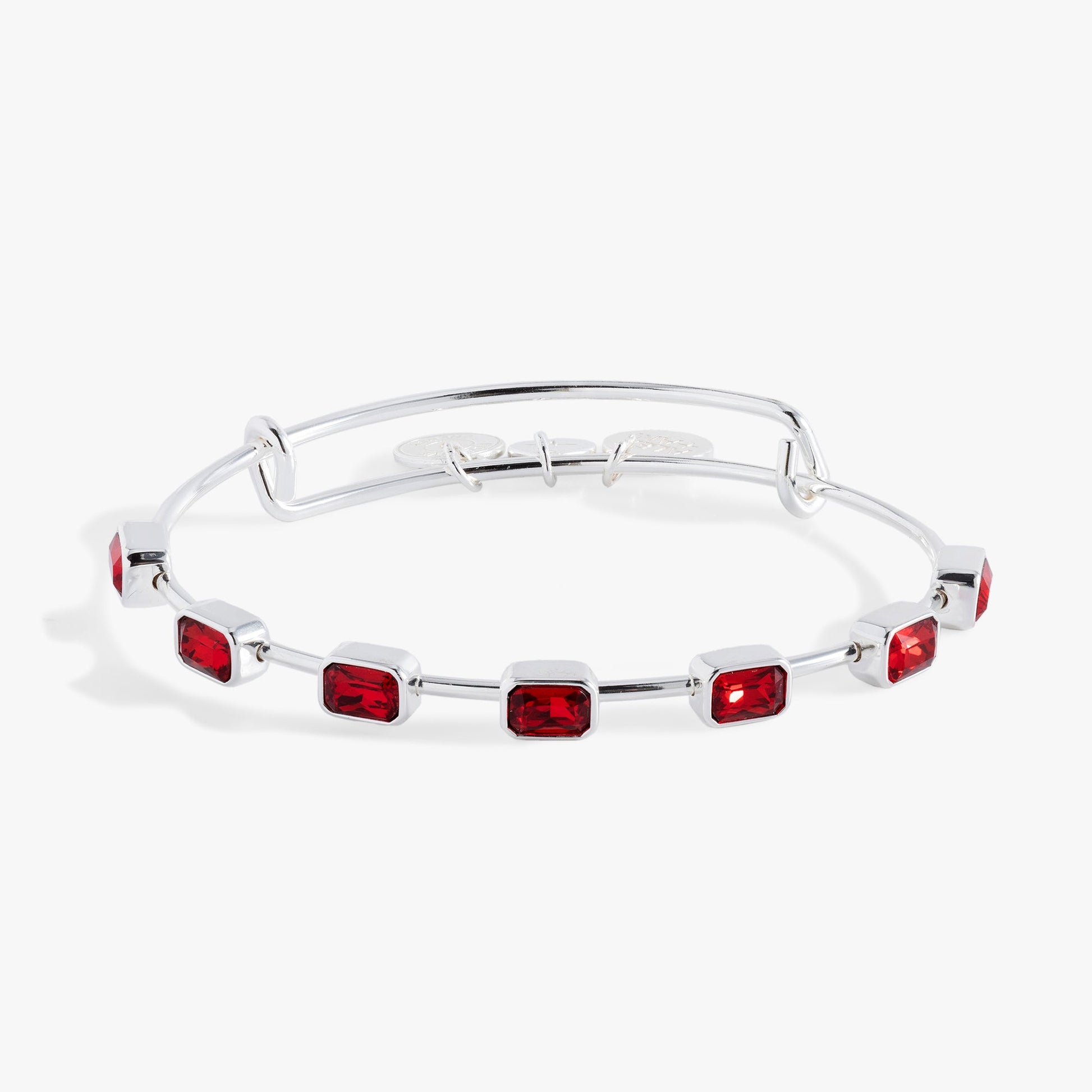 Whether you're commemorating a January birthday or you're drawn to the power and vitality of the garnet-colored crystal, the Emerald-Cut Birthstone Bangle will add personalized elegance to your stack. This birthstone bangle features seven emerald-cut garnet red crystals on an expandable wire bangle in a shiny gold or silver finish.