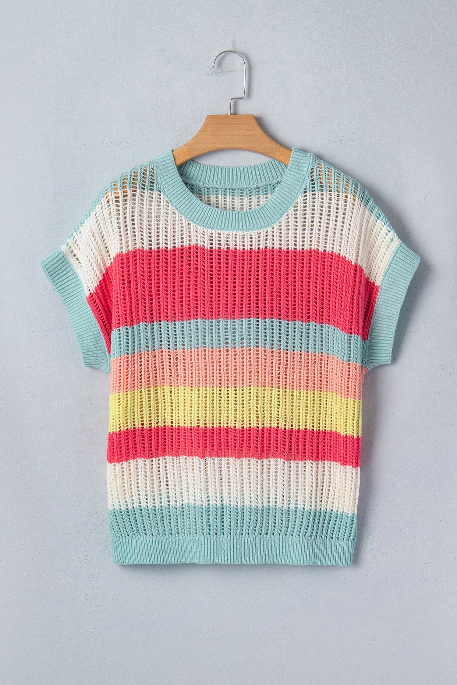 Stay comfy and put-together all at once in Joelle Knit Short Sleeve Sweater. This colorblock sweater top is eye-catching and fashionable. The hollow out knit fabric makes it breathable and comfy. Short sleeve design makes it perfect wear alone or layering. Easy to pair with jeans, skirts, or shorts.