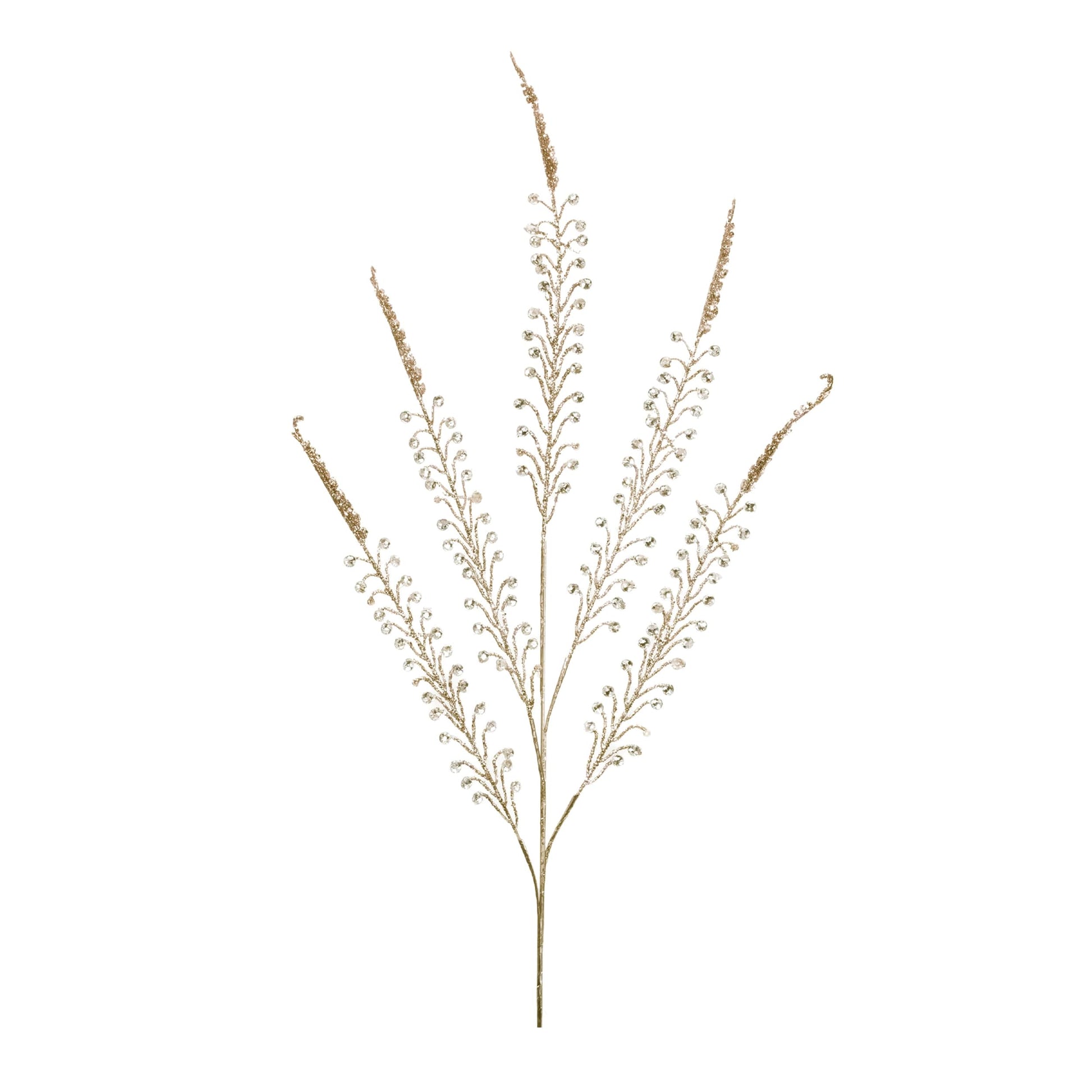 Add a touch of elegance and sparkle to your holiday decor with this Gold Beaded Fern Spray Set. Featuring festive gold and champagne tones with a chic glittered finish, these sprays bring luxurious shimmer to any seasonal arrangement. The intricate fern leaf design creates a sophisticated accent, perfect for enhancing your Christmas tree, wreaths, garlands, or floral displays. Perfect for adding a natural touch to your seasonal arrangements, these stems can be elegantly displayed in a vase, woven into a holiday wreath, or incorporated into garlands and centerpieces. With a set of 2, you have plenty of options to create stunning festive floral displays throughout your home. Elegant Beaded Fern Design – Brings refined texture and shimmer to seasonal decor. Versatile Holiday Accent – Ideal for Christmas trees, wreaths, garlands, and floral arrangements. Flexible Wired Stems – Allows for easy shaping, bending, and secure placement in any display. Suitable for indoor use only Measures: 12.5 x 1.5 x 34.5