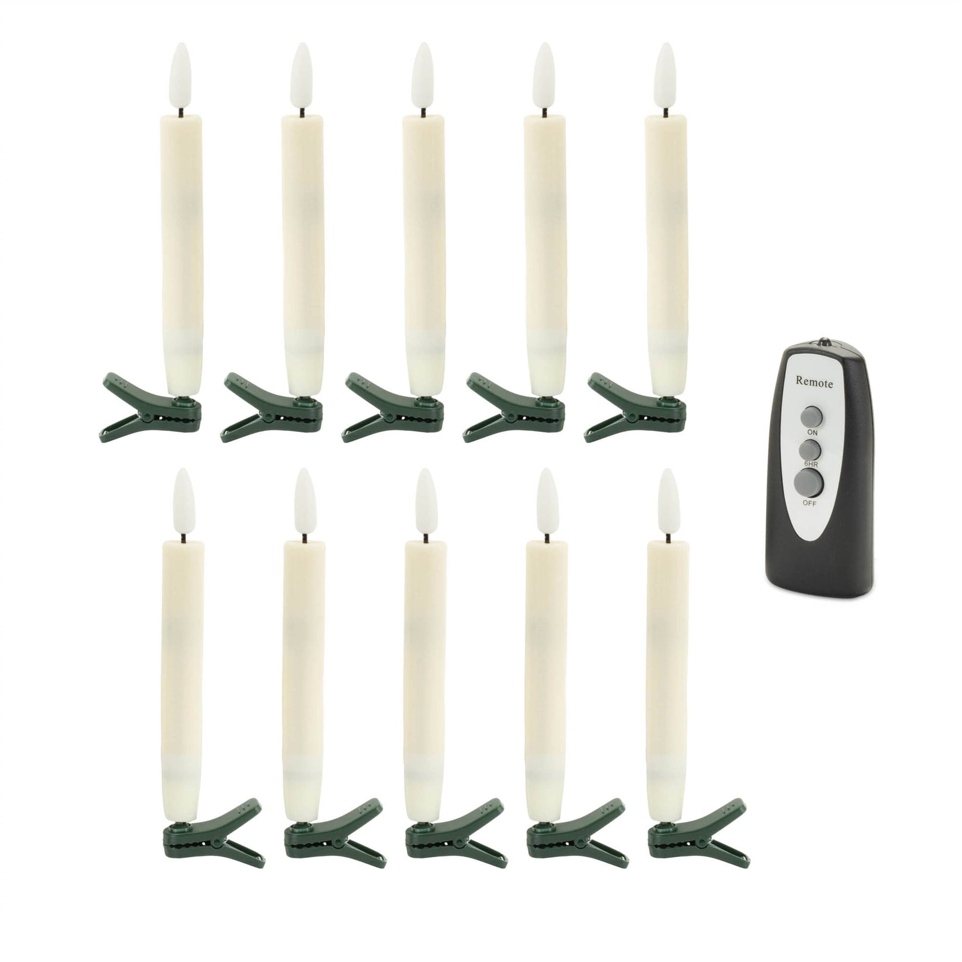 Add a warm, flickering glow to your seasonal displays with the LED Clip-On Taper Candles. This set of 10 ivory-colored candles features a sleek taper shape and a functional clip, making them perfect for attaching to your Christmas tree, wreath, or garland. The cool ivory tone complements a variety of holiday and home decor styles, while the LED lights provide a safe, long-lasting glow without the mess or worry of real flames. Each candle requires 1 AAA battery (not included), and the remote control makes it easy to manage their glow from afar. Convenient Clip-On Design: Attach easily to trees, wreaths, or garlands for versatile seasonal displays Cool Ivory Tone: Soft ivory color complements any holiday decor scheme Safe and Easy LED Lights: Battery-powered LED lights offer a warm glow without the risks of traditional candles Suitable for indoor use only Measures: 1.5 x 0.5 x 5.5; 1.5 x 0.5 x 3.25