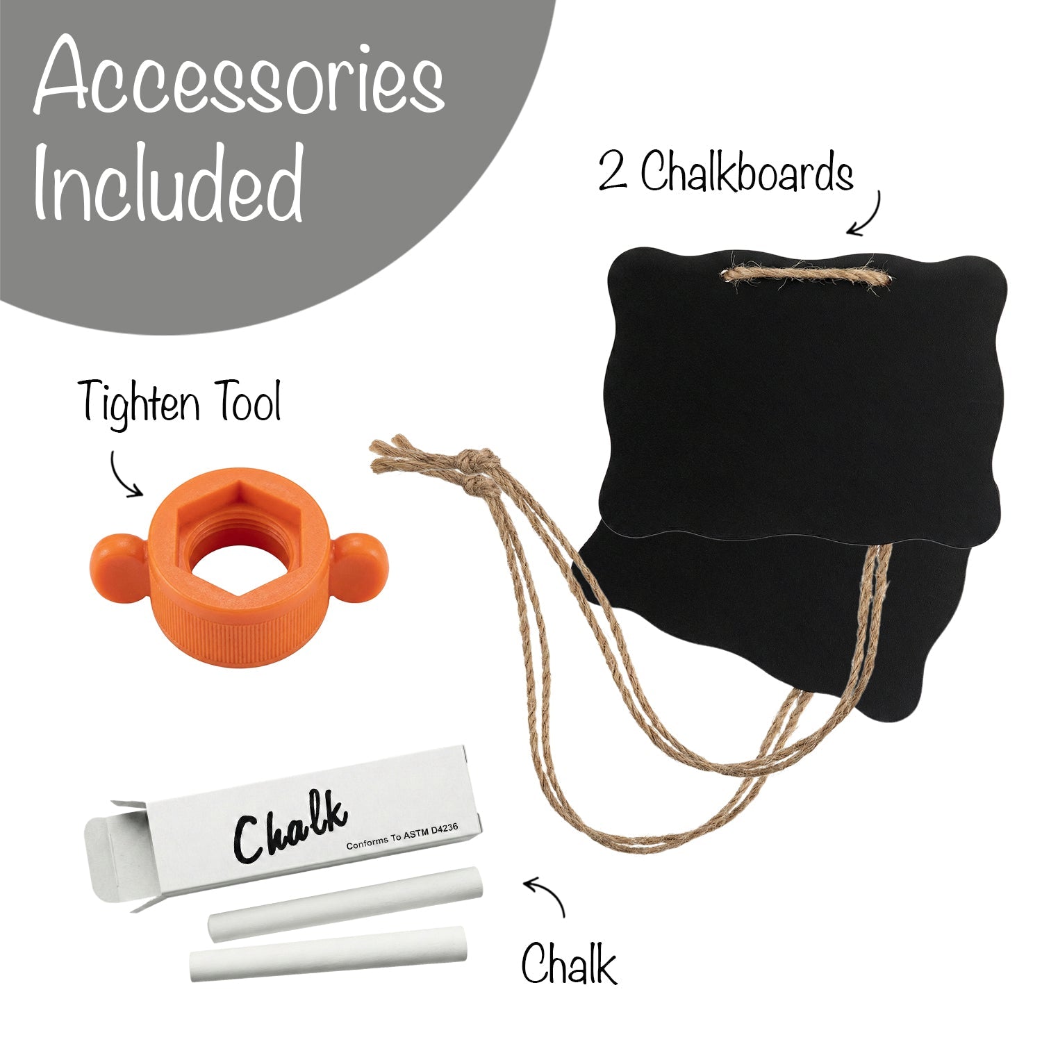 What's Included: Set of 2/ 1 Gal Dispenser Each, Metal Stand, Chalkboard, Chalk, Tightening tool, Spill mat, Extra spigot